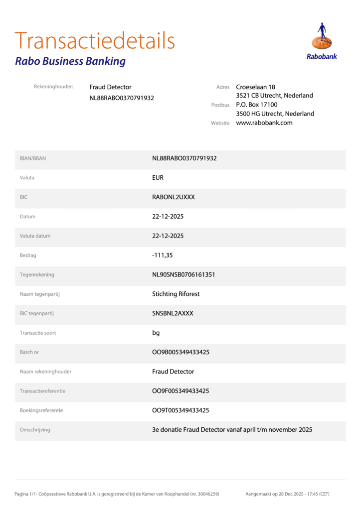 Fraud Detector ontvangt een kleine commissie als we iemand doorverwijzen naar een webshop en er vervolgens iets besteld wordt. Om iets goeds te doen voor het klimaat, doneren we een deel van alle opbrengsten aan stichting Riforest. Met het andere deel kunnen wij deze website onderhouden en regelmatig updates uitvoeren.